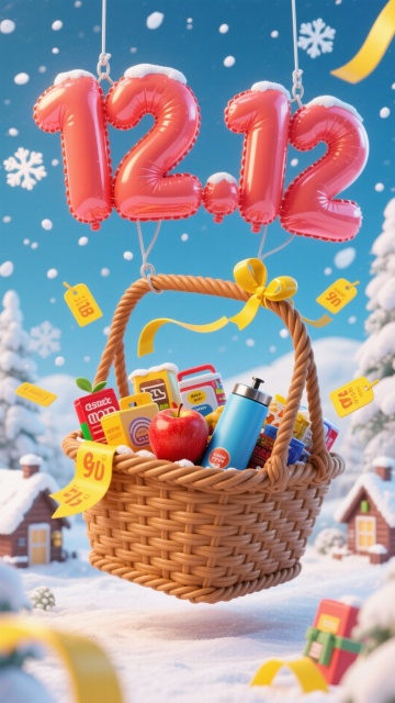 创作一张双 12 宠物用品促销主题的 3D 渲染海报,画面中心为红色热气球吊篮,内放宠物营养产品(罐装 + 袋装,带有宠物图案与品牌风格标识),搭配 1 只戴蓝色帽子、表情欢快的卡通柯基。背景是蓝天白云、粉色云朵,散落金色硬币、红色红包、带金色蝴蝶结的红色礼物盒。色调以红色为主,融合金色、蓝色、粉色,营造喜庆狂欢的促销氛围。构图采用中心聚焦,上方添加‘双 11 狂欢节’风格的立体促销文字,整体画面富有立体感,元素丰富且层次清晰,突出年终宠粉促销的热闹感。