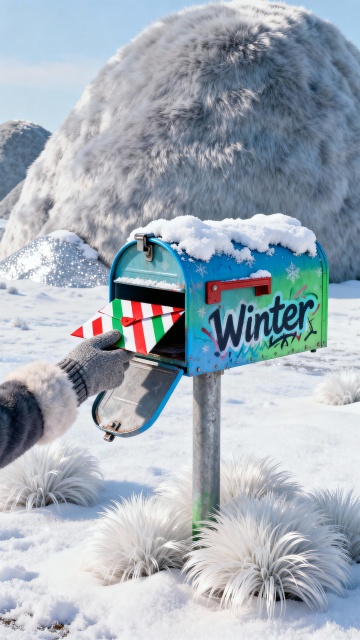 涂鸦风信箱点缀冬日雪景,毛发生长风植物环绕,重拟物风格呈现温馨喜庆氛围,虚拟自然中传递节日暖意。