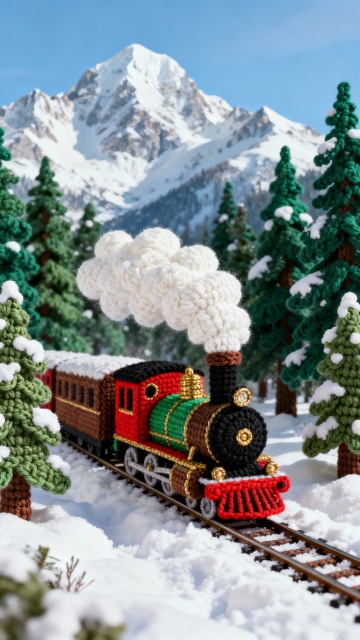 精致的钩针编织风格冬日场景,暖色调为主,阳光照耀下的温馨冬日村庄,雪覆盖的尖顶小屋,屋顶积雪泛着柔和的金黄色光芒,烟囱冒出白色钩针编织的袅袅炊烟,门前挂着红色钩针编织的灯笼和花环,穿着厚毛线衣的钩针小人在雪地上堆雪人,雪地里点缀着橙色和黄色的钩针编织小浆果,远处是覆盖着暖金色阳光的钩针山脉,天空飘着白色钩针编织的雪花,整体画面充满温暖治愈的冬日氛围,细节丰富的钩针纹理,立体感强,色彩以暖黄、橙红、米白为主,光线柔和明亮,营造出温馨舒适的冬日景象。