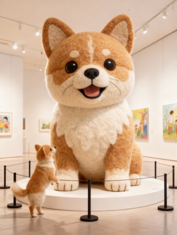 把图片主体做成充满创意和梦幻色彩的绘本风格的巨型毛毡艺术卡通风格雕塑放置在画面中心(主体的穿搭保持不变),主体站在一旁欣赏(与巨型主体形成比例反差),围栏隔离展示,背景是明亮的艺术展厅