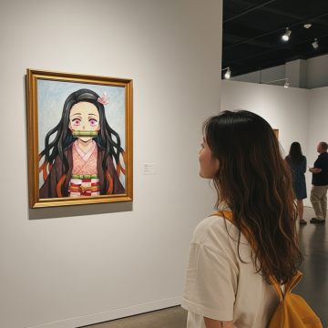 像素风动漫角色与真人COS联动,虚拟现实与现实交汇,刺绣质感画框点缀,卡通感十足的展览场景。