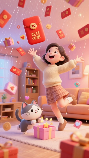 可爱软3D风格,一只暹罗小猫和柴犬,带着期待又快乐的表情,在暖色装修风格的玄关边围绕着全爆开的快递箱,快递箱标有 “双11不止宠你”,快递箱里面有猫粮、狗粮、零食等,周围地板散落着各种宠物玩具、如娃娃、玩具球等,空气中飘着带有小猫小狗形象的优惠券,背景色调以淡黄色、暖黄色为主,整体呈现温馨又幸福的购物体验。