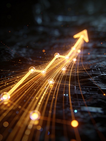 赛博朋克风格的金融数据可视化背景,深蓝色与霓虹粉为主色调,光影呈现科技感十足的网格光线与动态数据流,前景是发光的红色上升曲线图与蓝色网格线交织,背景为模糊的未来城市夜景,整体画面具有强烈的景深效果和玻璃质感,数据线条流畅且充满科技动态感,营造出高端、专业的金融科技氛围。