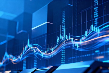 赛博朋克风格的金融数据可视化场景,深蓝色与霓虹粉为主色调,光线呈现科技感十足的蓝色光源与粉色高光交织,具有强烈的光影对比和细腻的阴影细节,前景是由蓝色网格线和动态波动的红色柱状图表构成的数据界面,图表线条流畅且带有发光效果,背景为深邃的宇宙星空,点缀着闪烁的星辰和星云,营造出神秘而充满未来感的氛围,整体画面采用近景聚焦数据图表、远景虚化星空的景深控制,呈现出清晰的视觉层级,科技感十足的数字艺术风格,强调数据流动的动态美感与宇宙空间的广阔深邃,信息传达高效且符合科技与金融融合的主题。