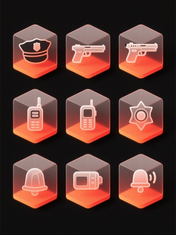 科技感十足的3D轻拟物图标,玻璃质感搭配霓虹光影,呈现未来感体积效果,红色光晕烘托警用主题,视觉冲击力强。