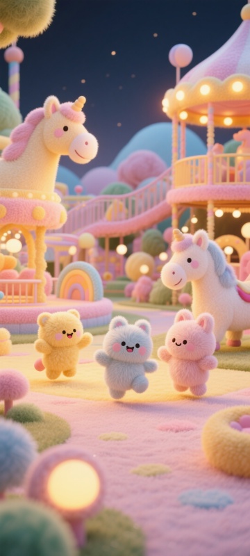 梦幻夜景中的毛绒小动物在软3D风格的童话乐园中欢快奔跑,融合粘土质感与卡通元素,营造出温馨可爱的节日氛围。