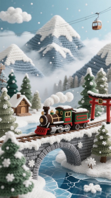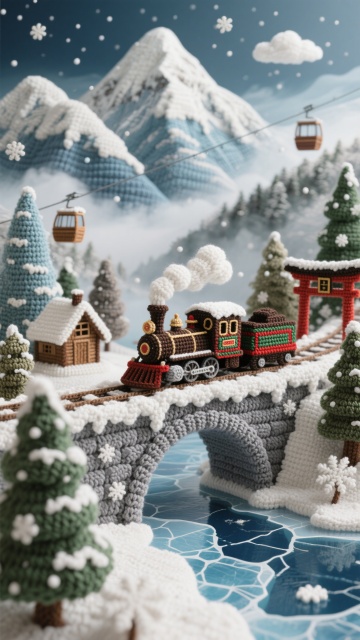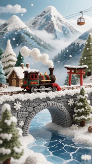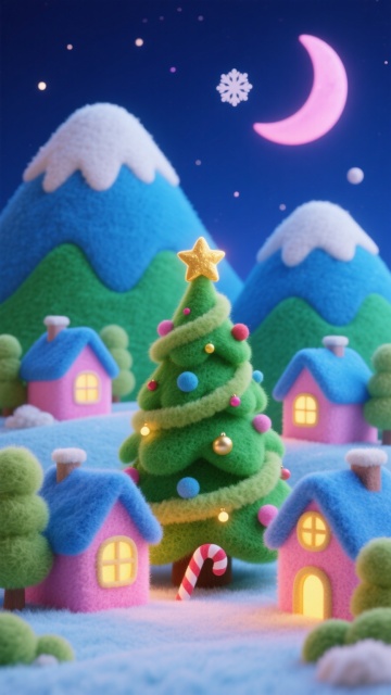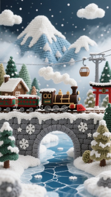 毛线编织的冬日小镇,融汇刺绣风与微缩艺术,卡通人物在雪中嬉戏,暖灯映照出温馨梦幻的圣诞氛围。