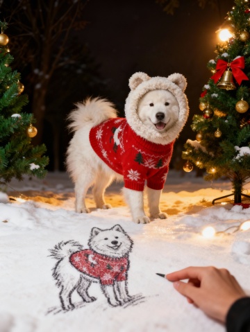 写实摄影风格,中心偏右构图。主视觉是戴雪白雪人头套(红鼻子、有耳朵)的狗,蹲户外雪地帐篷旁,爪扒小雪花,眼睛亮闪闪。左下方伸出一只手举圆滚滚毛绒挂件(复刻狗戴头套造型,软绒蓬松)。背景是覆雪的松枝、迷你圣诞树(挂彩灯),旁侧放热饮罐,雪花轻落,暖光从帐篷透出,软萌又有冬日户外感。