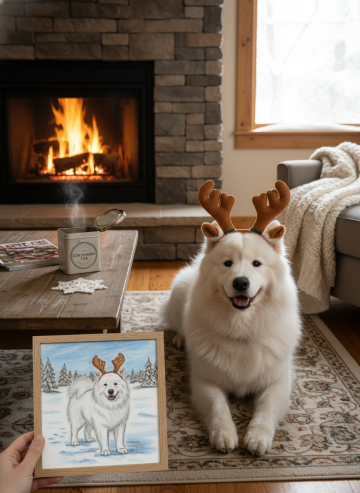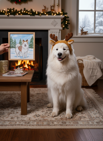 拟人风漫画叙事,实景感雪景中金毛犬的冬日独白,柔和光影与温暖木屋营造温馨舒适氛围,清新治愈,充满故事感。