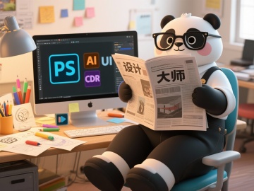 软3D风格熊猫拟人形象,戴眼镜读报,卡通感十足,办公场景充满可爱与创意,展现设计主题的趣味表达。
