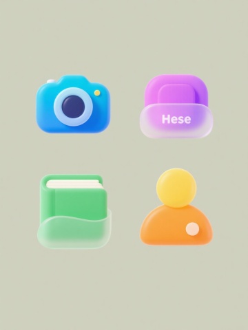 4个不同元素的3D立体图标系列,每个图标均采用光滑半透明渐变材质,带有柔和高光与阴影,呈现出圆润的磨砂玻璃设计,图标内容分别为:柔和蓝色的相机、彩色花瓣的相册、黄色的文件夹,粉紫色音符,所有图标规整排列在纯色背景上,保持统一的3D立体风格与明亮欢快的氛围。