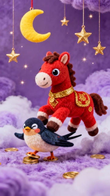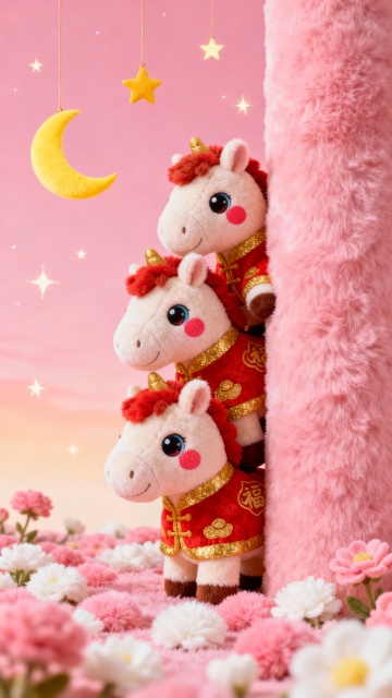 三个穿着红色和金色毛绒服饰的发财小马玩偶,它们堆叠在一起,脸颊带着可爱的红晕,眼睛圆溜溜地望向天空,周围是粉色和白色的毛绒花朵,背景是渐变的粉紫色天空,挂着黄色的弯月和闪烁的金色星星,整体呈现出温暖、可爱、充满童趣的毛绒材质风格,营造出温馨发财的氛围。