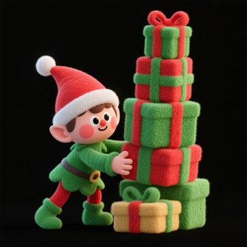 六个具有3D立体风格的圣诞元素集合,每个元素采用完全不同的材质,造型统一,规整排布在纯色背景上。元素包括:顶部带金色星星、挂有彩色球和拐杖糖的圣诞树;戴着绿色围巾、怀抱心形礼物、有棕色鹿角和红色脸颊的驯鹿;装满礼物、顶部有姜饼人、装饰有冬青叶和红色浆果的红色圣诞袜;系有金色铃铛和冬青叶的红白条纹拐杖糖;棱角分明、线条清晰的白色雪花;戴着红色圣诞帽和条纹围巾、有胡萝卜鼻子和红色手套的雪人。材质分别为:光滑塑料质感的圣诞树,哑光陶瓷质感的驯鹿,毛绒布料质感的圣诞袜,金属光泽质感的拐杖糖,透明水晶质感的雪花,柔软针织质感的雪人。整体色彩鲜艳明快,保持原图的圣诞氛围和元素特征,光影效果柔和,立体感强,各元素间距均匀,构图平衡。
