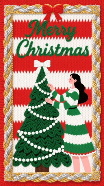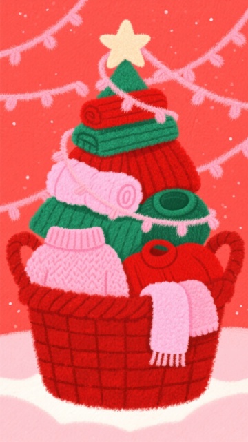 插画风圣诞树由毛衣堆叠而成,轻拟物与毛发生长质感结合,红绿粉配色充满喜庆与温馨,篮中针织物传递节日温暖。