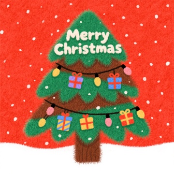 喜庆红底雪景中,毛茸茸的圣诞树挂满礼物与彩灯,插画风结合轻拟物与毛发生长质感,卡通感十足,传递温暖节日氛围。