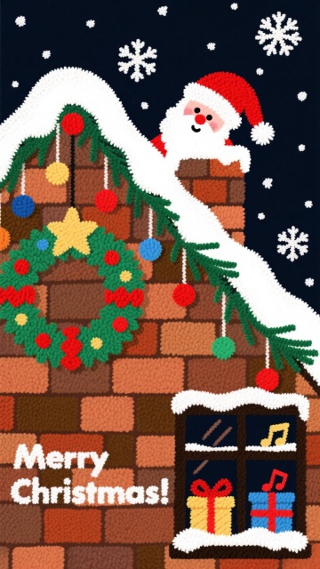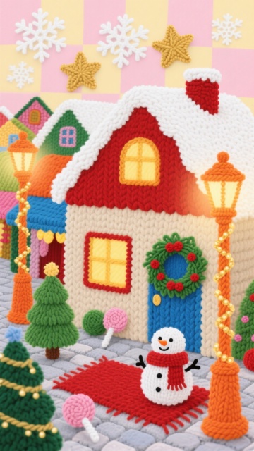 毛发生长风与刺绣风结合的3D插画,呈现梦幻温馨的圣诞小镇,色彩明亮,充满可爱与喜庆感。
