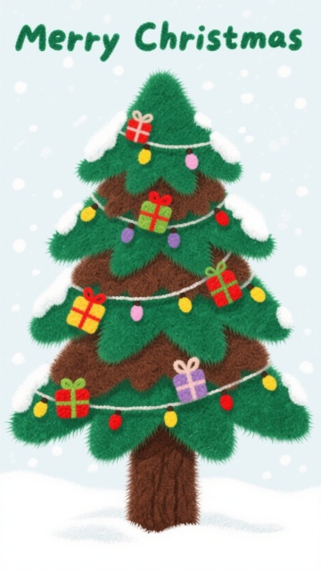 插画风圣诞树,毛发生长质感,轻拟物设计,点缀彩灯礼盒,雪景背景,喜庆卡通感十足,节日氛围浓厚。