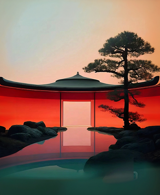 晨光穿透薄雾,洒在古老石制建筑的飞檐翘角上,建筑周围环绕着青苔覆盖的石阶与平静如镜的水面,水面倒映着建筑的轮廓和飘落的花瓣,整体色调以深灰蓝、米白和浅赭石色为主,营造出宁静而高级的历史氛围感,光影柔和,细节丰富,宛如一幅精致的水墨画。详情