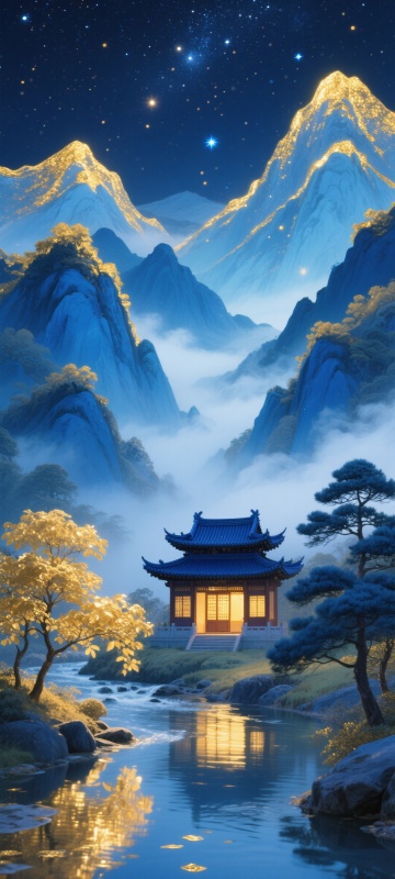 梦幻夜色中的中式庭院,水墨与光影交织,星河倒映溪流,静谧而唯美的虚拟自然画卷。