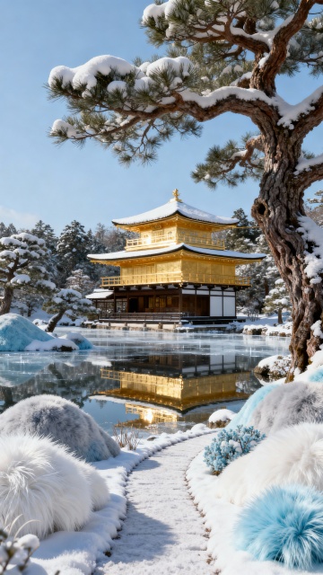 侧拍全景,冬日的金阁寺覆着薄雪,金箔外墙在阳光下依旧耀眼。下方湖面结起厚冰,清晰倒映出金阁与周围的松林,松林披雪枝干遒劲,小径覆雪无人踏足,日式庭院的静谧与冬日纯净感拉满。