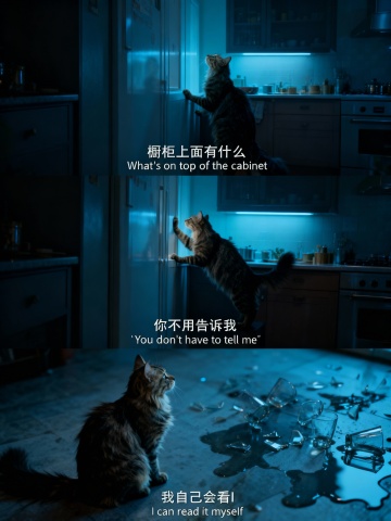三宫格艺术感写真图,场景为温馨客厅,色调呈暖棕与米白渐变,布置有沙发、地毯。画面主体为参考图中的橘猫。最上面一张为近景,橘猫耶在客厅角落的背影,仿佛在研究某物,添加中英字幕 “家里的秘密是什么 What's the secret at home”;中间一张是橘猫在抓沙发边,仿佛伸懒腰,添加中英字幕 “你不用告诉我 You don't have to tell me”;下面一张是特写,背景是抓破被拆得散落、棉絮乱飞的沙发靠枕,橘猫神态灵动,添加中英字幕 “我自己会探索完 I will explore it all myself”;整体色调温暖有趣,三张图合成横向三宫格。