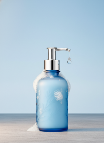 产品竖立在台面上,旁边和顶部各有一团白色泡沫,增添清洁感,周围有漂浮的泡泡,背景有一个淡黄色圆形光影,营造高级质感。柔和光线,摄影级写实效果,高端护肤产品广告风格,极简设计,现代美学,高清细节。