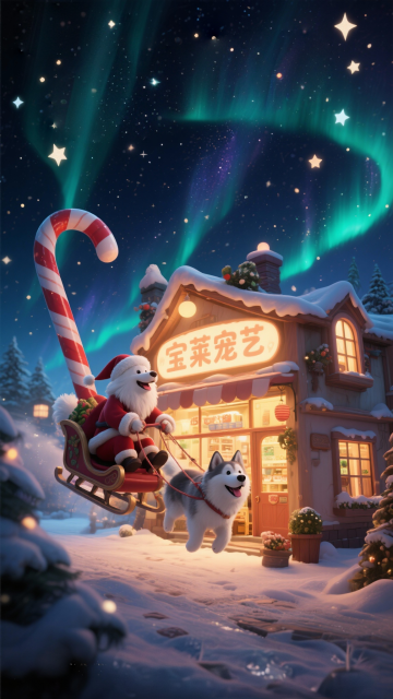 夜晚神奇的圣诞村庄,屋顶是拐杖糖的宠物店,店招叫宝莱宠艺,萨摩耶装扮的圣诞老人的雪橇飞过繁星点点的天空,拉雪橇的是成年阿拉斯加犬,背景是闪烁的极光。异想天开,幻想艺术,吉卜力和托马斯·金卡德的风格,发光,光晕,梦幻氛围,广角镜头。宠物圣诞节圣诞节海报设计。