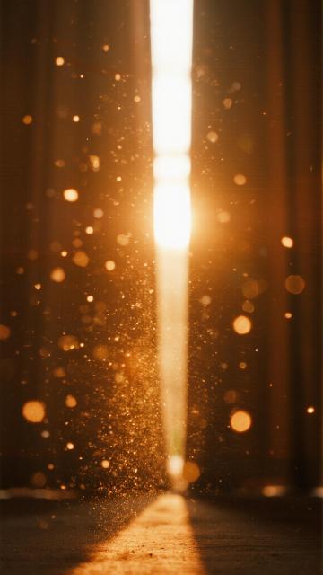 深色背景上,中央有一道明亮的橙黄色光束,光束呈现出柔和的渐变效果,从中心向四周逐渐扩散并淡化,光束中散布着细小的白色光点,营造出温暖而梦幻的氛围。