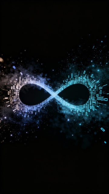光感科技粒子汇聚成无限大符号,具有不同的透视倾斜角度,图形大气抽象不生硬,背景为玫红色渐变到蓝紫色,科技未来感风格