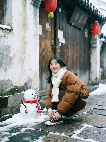国潮风与复古感交织,雪中古巷映衬中式美学。拟人化雪人添趣味,胶片质感渲染温馨冬日氛围。