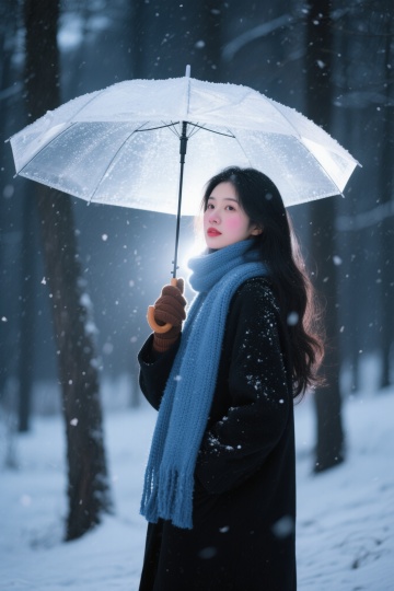 夜晚雪景森林,黑长发女性撑伞转头看镜头侧逆光勾勒脸部轮廓与发丝,蓝色粗针织大围巾,黑色大衣与手套,皮肤通透,淡粉色腮红晕染脸颊下巴,红棕豆沙唇釉边缘模糊,旧胶片机闪光灯效果,雪花飘落有虚实质感,清冷暗灰色蓝调,胶片颗粒,近景构图,人物侧身站立撑伞,居中占比三分之一,真实灵动可爱