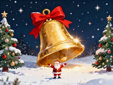 圣诞节主题插画,画面中有戴着红色圣诞帽、穿着红色棉袄的卡通小雪人,手持金色铃铛,周围环绕着绿色圣诞树,树上挂满彩色彩灯和礼物盒,背景是飘落的雪花和明亮的黄色星星,整体色调温暖喜庆,充满节日氛围