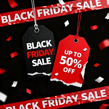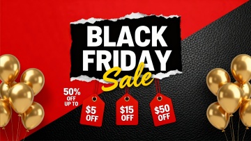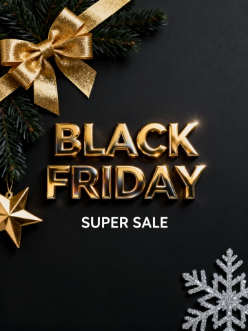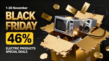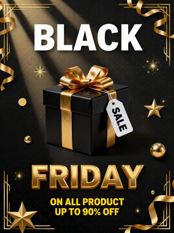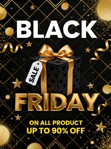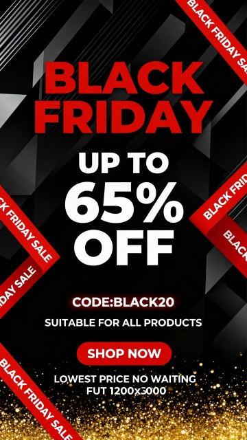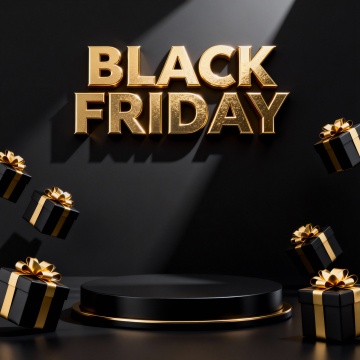 黑色星期五促销主题的产品宣传图,整体采用黑金配色营造高端促销氛围。画面以黑色幕布为背景,点缀金色光斑增强节日感,中央及右侧展示图中商品,通过黑色展台和铜色底座分层陈列,左侧有 'Black Friday Deals Get up to 35% 0FF'的白色与橙色渐变文字标题,下方配'Shop Now白色按钮,周围装饰橙色气球、红色礼盒及购物车模型,左下角放置标有'SAVE UP TO 35% 0FF'的红色促销立牌,整体构图左右对称,产品与促销信息主次分明,光影明暗对比突出产品质感。