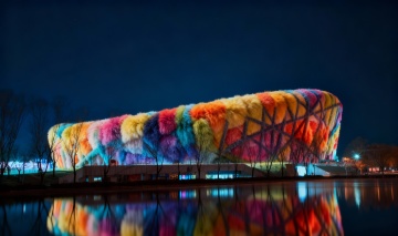 写实摄影风格,清晨或黄昏时分,开阔的户外场景,天空呈现渐变的浅蓝色与柔和的橙黄色霞光,远处地平线上有明亮的太阳正在升起或落下,云朵被染成温暖的金色。画面中央是新设计的抽象几何造型白色建筑结构,由多个不规则立体块面组合而成,具有现代简约的线条感和雕塑般的形态,建筑主体呈现光滑的白色表面,部分区域有通透的玻璃或亚克力材质,光线透过建筑结构形成独特的光影效果。地面铺设着深灰色带有细腻复古花纹的大理石纹理地板,表面光滑有反光,能清晰映照出天空和建筑的倒影,地板接缝处线条利落。两侧是由竖条形半透明材质构成的屏障,呈现微妙的磨砂质感,柔和地分隔空间并过滤光线。整体构图采用对称式布局,建筑位于画面中央,地平线水平居中,营造出庄重、宁静而富有神圣感的氛围,光线柔和且方向性明确,阴影过渡自然,色彩和谐统一,画面具有极高的清晰度和细节质感,符合高端建筑摄影的视觉标准。