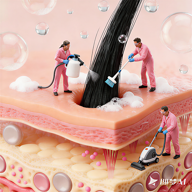 美妆微缩工厂 整体粉白色调。车间里,一群流水线员工在制作一支巨大的美妆刷,有的在修剪刷毛,有的在擦拭,有的在梳刷毛,有的在洗毛巾;环境明亮干简洁。详情