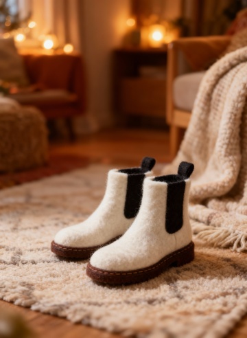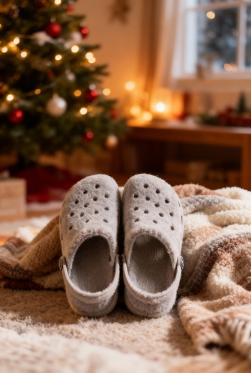 温馨冬日家居场景,柔和光线洒落,米色毛毯以轻拟物线条勾勒温暖质感,彩色毛线球点缀其间,营造舒适面料风与简约主义氛围,实景感十足。