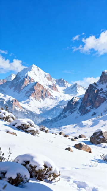 超写实摄影风格的雪山湖泊全景,纯净的蔚蓝色渐变天空与白雪覆盖的连绵山脉形成鲜明对比,前景是冰封湖面呈现出清晰的山脉倒影,山间萦绕着淡淡的薄雾增添层次感。画面整体采用高清晰度、细腻的光影处理,阳光从侧上方照射形成柔和的阴影过渡,雪山表面的纹理与冰面的裂痕细节清晰可见。轻盈的雪花从天空中缓缓飘落,部分雪花点缀在近景的冰面上,营造出宁静而圣洁的冬日氛围,色彩以蓝白为主色调,整体构图遵循三分法,保持画面的平衡与开阔感。
