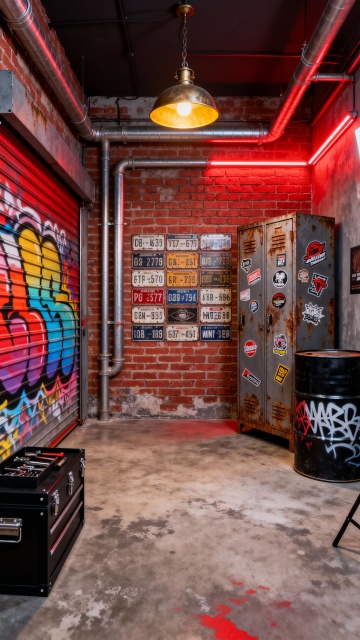 工业感与复古风交织的酒吧空间,混凝土肌理墙搭配金属吊灯,几何造型酒架点缀其间,暖光营造静谧氛围,新粗野风与质朴感完美融合。