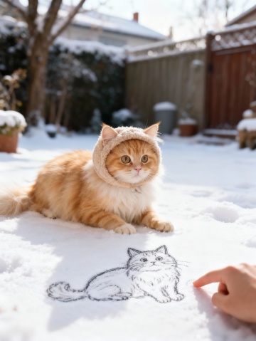 写实摄影风。画面主视觉是戴着毛绒头套的宠物与宠物的雪地画像合影。画像为写实风全身像,像用手指画在雪地上。宠物神态可爱,圣诞庭院场景。