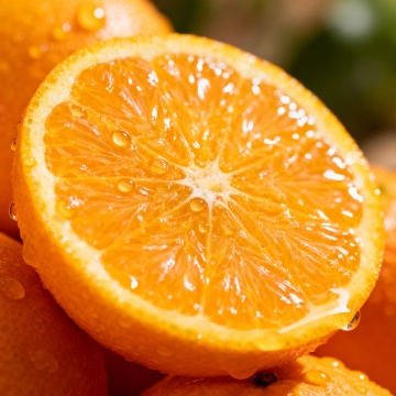 超写实摄影风格,大量新鲜橙子组成的背景,特写镜头,包含完整的圆形橙子和对半切开的橙子剖面,剖面露出清晰可见的橙瓣纹理与白色脉络,橙色果皮光滑带有自然光泽,部分切开的橙子上点缀着一片绿色的橙子叶,整体色彩以明亮饱满的橙黄色为主,光线从上方均匀照射,形成柔和的高光与自然阴影,突出橙子的水润质感和立体感,构图紧密充实,无留白,展现橙子的新鲜与活力。