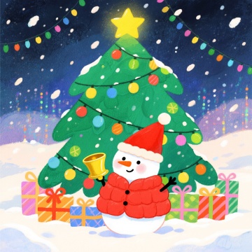 插画风雪人捧着饺子,拟人化设计充满可爱感与温馨感,水彩质感渲染梦幻冬日场景,暖色系烘托节日氛围。