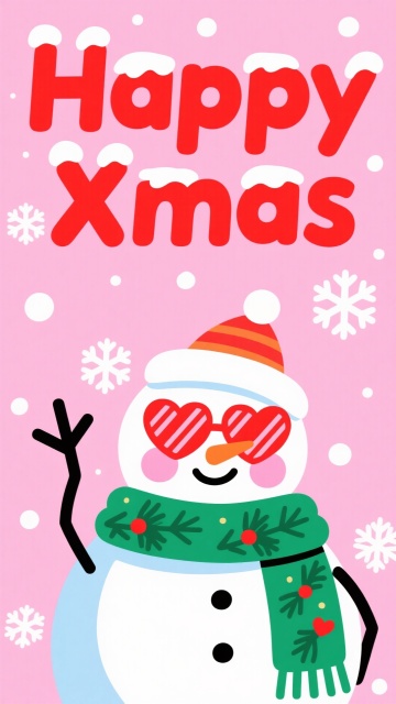 扁平风卡通雪人戴心形墨镜,粉色背景点缀雪花,波普艺术风格文字“Happy Xmas”,拟人化设计充满可爱与喜庆感。