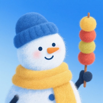 一个萌系雪人形象。它戴着蓝色帽子,系着黄色围巾,面带微笑,手里拿着糖葫芦。蓝色渐变背景。