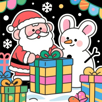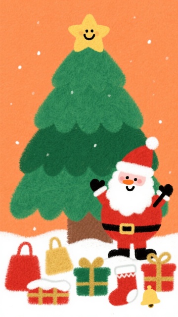 插画风圣诞场景,扁平化设计融合毛发生长质感,拟人化圣诞老人与笑脸星星树顶,搭配礼物与雪景,传递喜庆卡通氛围。