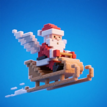 像素风圣诞老人驾雪橇飞驰,软3D质感搭配毛发生长细节,卡通感十足,喜庆氛围洋溢,节日气息浓厚。