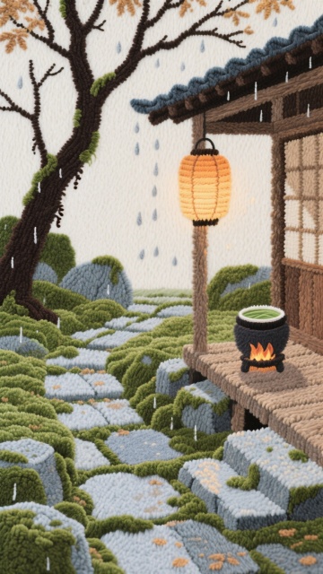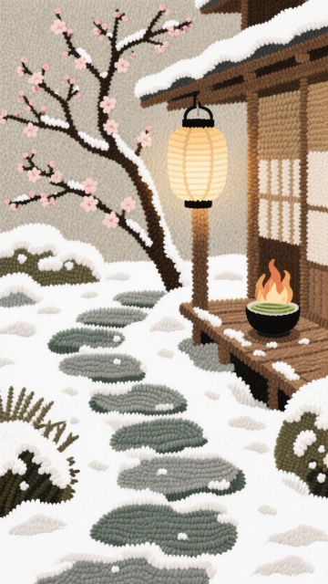 刺绣风插画,融合中式庭院与浮世绘意境,雪中梅花、暖灯与茶炉营造静谧温馨的冬日氛围。