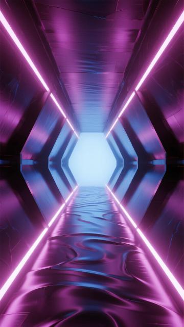 未来科技感十足的深邃走廊,两侧是对称排列的弧形金属结构墙体,表面有几何切割的面板和发光窗口,墙面和地面边缘镶嵌着明亮的紫色与蓝色霓虹灯管,灯光在光滑的黑色反光地面上形成清晰倒影,走廊向远方延伸并汇聚于尽头的粉紫色光晕,顶部有细长的垂直线条灯光点缀,整体呈现出赛博朋克风格的3D渲染效果,色彩以深蓝、紫色为主调,光影对比强烈,营造出神秘、科技、未来主义的氛围,空间感纵深感强,细节精致,具有强烈的视觉引导性和沉浸式体验。