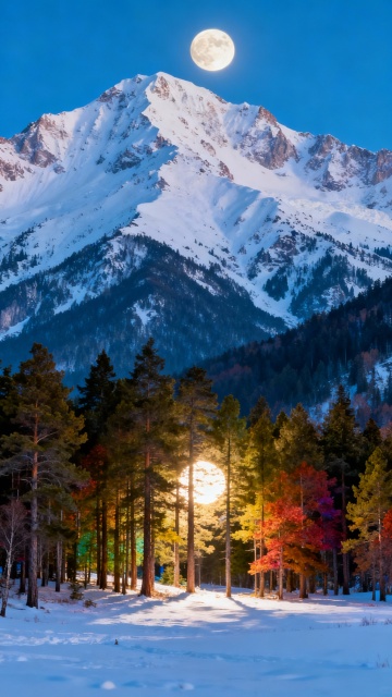 宁静的雪夜中,一棵孤立的梅树繁花盛开。枝头缀满鲜艳的红花,被一轮满月空灵柔和的光芒照亮。积雪反射着月光,创造出一种魔幻而宁静的场景。电影般的光影,奇幻艺术,梦幻感,高度细节,氛围浓厚。