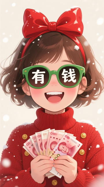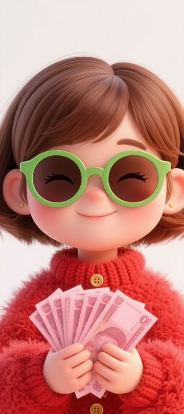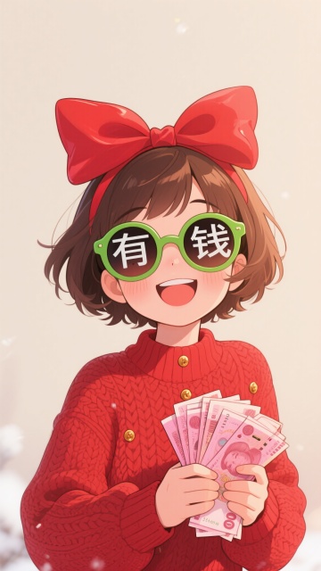 在温馨柔和的氛围下,可爱卡通风格的毛绒质感插图。画面聚焦于主体——拥有一头俏皮短棕色头发的女孩,头发呈现柔软的毛绒质感。她头上戴着一个大大的红色蝴蝶结发带,发带材质似绸缎,泛着微微光泽,蝴蝶结的褶皱细节清晰可见,边缘有毛绒感。女孩身着一件红色毛线衣,毛线纹理细腻逼真,衣身上点缀着几颗金色的小纽扣,衣物整体有蓬松的毛绒质感。她的脸上架着一副圆形绿色太阳镜,镜片色泽鲜亮,上面用醒目的白色字体清晰呈现汉字“有钱”。女孩双手紧紧抓着一大把粉红色钞票,钞票边缘微微卷曲,带有毛绒边缘。她脸蛋红扑扑的,像熟透的苹果,嘴角高高扬起,露出开心愉悦的表情,眼睛眯成弯弯的月牙,脸颊和耳朵有毛绒触感。背景是一片柔和的米色,如同冬日的暖阳洒下,为整个画面增添温暖、惬意之感,整体洋溢着欢快的氛围,上方大面积留白,人物位于中间偏下