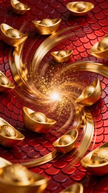 环境:周围有金色的元宝、铜钱,背景是红黄渐变的色调,整体营造出富贵、吉祥的氛围。